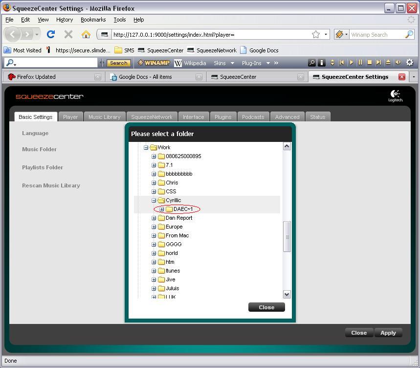 I have reported this bug to support. However, it appears that the problem description in Bugzilla does not precisely represent the one I described, even though I'm sure they are related. Some details are incorrect, so below is the copy of the original support request. ----------- Hello, I had SqueezeCenter 7.1 installed on Windows Server 2003 x64. Everything used to be fine until I updated to the latest stable version (7.21). Now SqueezeCenter is able to scan (and see) file and folders with Latin characters in them only, all my Cyrillic-based collection is no longer visible. Even when I attempt to go to Settings->Basic Settings and click on "Browse" next to Music Folder in order to select the folder I require - only part of the folder tree is visible, folders with Cyrillic characters in them are simply not present in the list. I upgraded to the latest trunk version (7.3 - 23831), but the problem remains. It would be unfortunate if I had to downgrade, as new firmware offers some nice enhancements. Could you have a look at this issue, please? Thanks in advance. Vyacheslav Borukhson P.S. I double-checked all of the above by installing SqueezeCenter 7.3 on Windows XP SP3 inside a virtual machine - same results. ----------- To summarize - my primary OS is Windows Server 2003 x64. The system is fully Cyrillic-capable and in fact runs an Exchange Server 2007, where Cyrillic support is enabled and is working properly. The symptoms here, however, are slightly different - if I was to take either screenshot 1 or 2 as an example, the following would be true: I used to be able to see garbled Cyrillic in both cases before, just as screenshots show, but now I am unable to seen any. Makes no difference if I'm trying to choose Music folder or browse one - nothing which has Cyrillic in it appears, only Latin-based names are visible. Before, even though file and folder names appeared garbled, everything else was working - scanner could pick those files up, and tags were shown correctly. Now SC does not see Cyrillic-based file and folder names and scanner does not scan them, which results in the Cyrillic-basde part of my collection being completely unusable.