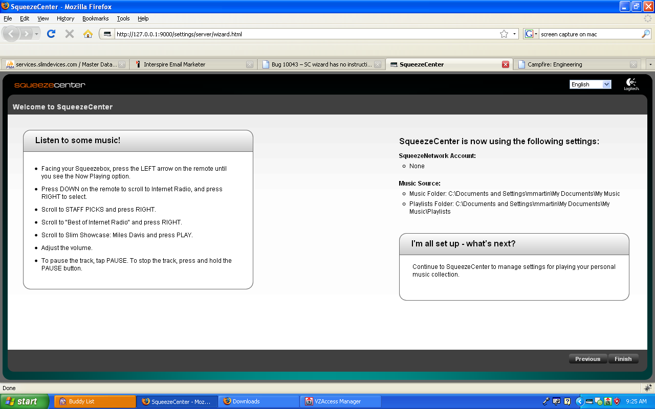(In reply to comment #8) > Created an attachment (id=4348) [details] > last pane of SC install > Reclassifying as enhancement, re-targeting. See attached screenshot of last wizard pane. New user enters PIN--their device is successfully connected to SN. Next, we instruct users--if you want to listen to your local music, download and install SC. At the end of the SC wizard (which the user downloaded because we told them they would be able to play their local music), the only instructions are about how to play internet radio. However, to actually play their music at this point the user needs connect their device to their newly installed SC (Settings->Music Source...or whatever). The whole point in downloading SC is to play local music (hence why the wizard asks)--so it's important that the wizard FULLY guides the user through the steps necessary to do just that, otherwise we are not delivering on the promise of the software itself.