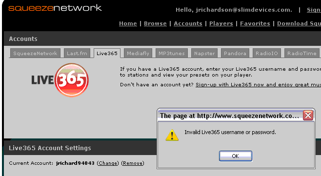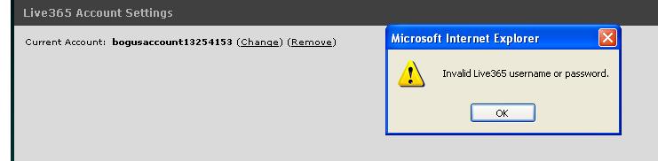 Created attachment 4382 [details] error message When testing Live365, I am able to put in a bad account, while an error box will pop up, SN populates and saves the data as if it were a valid account. Other sign up services in SN will not save the data if it's bad.