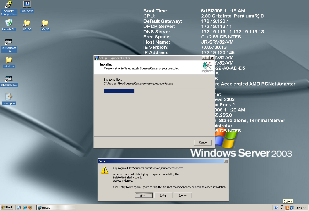 I don't think this is a timing issue. My system is extremely fast. (Dual Xeons, running on server class hardware.) I left the error message on the screen for about 5 minutes, and hit retry. No change in behavior. I then tried to manually delete the mysqld.exe file, but got an access denied error message. Something is keeping that file open. I looked at task manager, and mysqld.exe is not running, and is not listed as a process. Finally, I disabled the SqueezeCenter service, rebooted the system, and tried the installation again. This time it worked. I did notice one thing. After disabling the SqueezeCenter service and rebooting, the tray icon was gone. (During the initial installation, this icon was present, although it was dark.) Perhaps the tray icon is monitoring the SC service, and is holding open mysqld.exe?