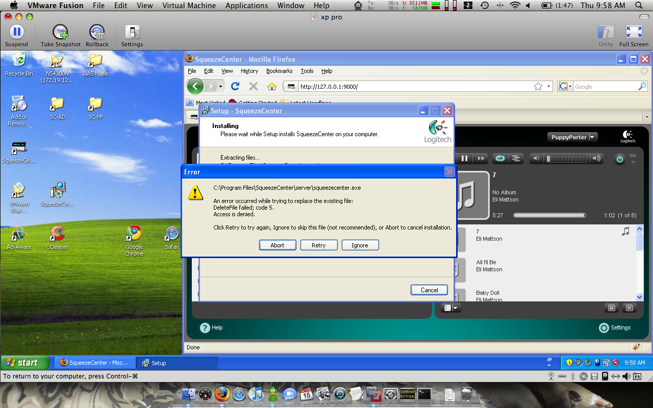 I do see squeezetray disapear nothing special about my Vista install, windows firewall, no virus software if I wait up to 5 min after the error message appears, then I notice SQ.exe does close and I can 'retry' OK so it looks like SQ.exe is just taking a long time to shut down Music Library only has 10 items in it