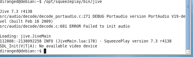 Created attachment 4819 [details] Error on Debian 5.0 When I try to start up SqueezePlay from Ubuntu (8.04, 8.10) or Debian (5.00) it fails to start with an error about "No Available Video Device". Attached is a screenshot from Debian 5.00. I'm still downloading Debian 4.0r7, so I havn't tried that yet.
