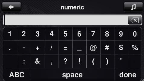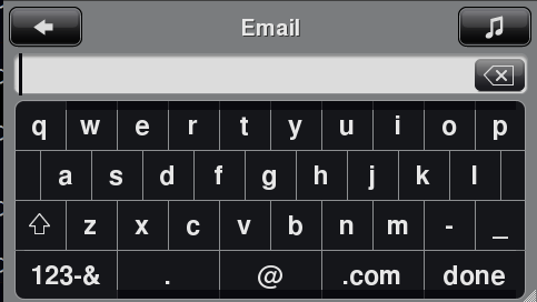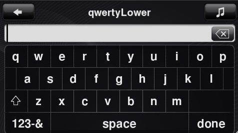 Additional cosmetic issues to resolve: 1. Cursor height should be 26px high and NOT extend into text entry window border 2. The top buttons (back, ?), text entry field, and keyboard should share the same right/left edge alignment. For example the left vertical edge of the back button, left edge. Current build r4940 text entry window and keyboard aligned, but not aligned to titlebar buttons (left/right). 3. Keyboard key font sizes are not correct main keys: QWERTY/1234.../@#$ - FS Bold 24px bottom row keys: (any text grouping whether numeric or alpha) 123-&/ABC, done, search, .com - FS Bold 20px (any individual characters/symbols) @, ., _, etc. - FS Bold 24px 4. "Done" button should have added emphasis, propose quick fix of inc. contrast RGB 231,231,231. 5. Delete button appears misaligned top/bottom. Could move up ~1px. 6. Shift icon should move down ~1px to appear centered top/bottom 7. There is no way to get to addition symbols. Need to add jump button to lower, left corner (above ABC). Enhancements: 8. Cursor should blink on/off every sec. Currently artwork is static. 9. Press and hold on delete button should clear all. 10. Back button in titlebar currently goes back one character at a time. Back button should always be back to previous menu.