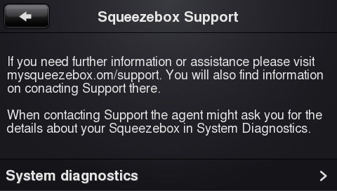 Except that "mysqueezebox.om" is spelled wrong. As is "conacting". Come on guys. Also we should standardize on capitalization for "System Diagnostics". I propose that we use caps on both in both cases and in the menu. Finally, this is really a "more help" screen rather than a support screen. Ok, so to clean this up: -------------------------------------------- More Help If you need more help with your Squeezebox, please visit mysqueezebox.com/support where you can find answers to many questions and contact our support team. If you do contact the support team, you may be asked for technical details about your Squeezebox provided by System Diagnostics, available below. System Diagnostics >