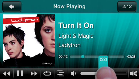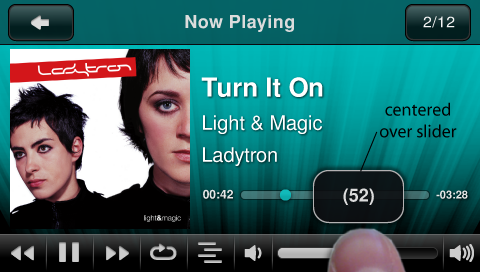 Its difficult if not impossible to adjust sliders accurately because your finger is I the way. There needs to be some pop up or zoom up of the slider when using the touch panel. This is a problem for volume control as well as intra track navigation.