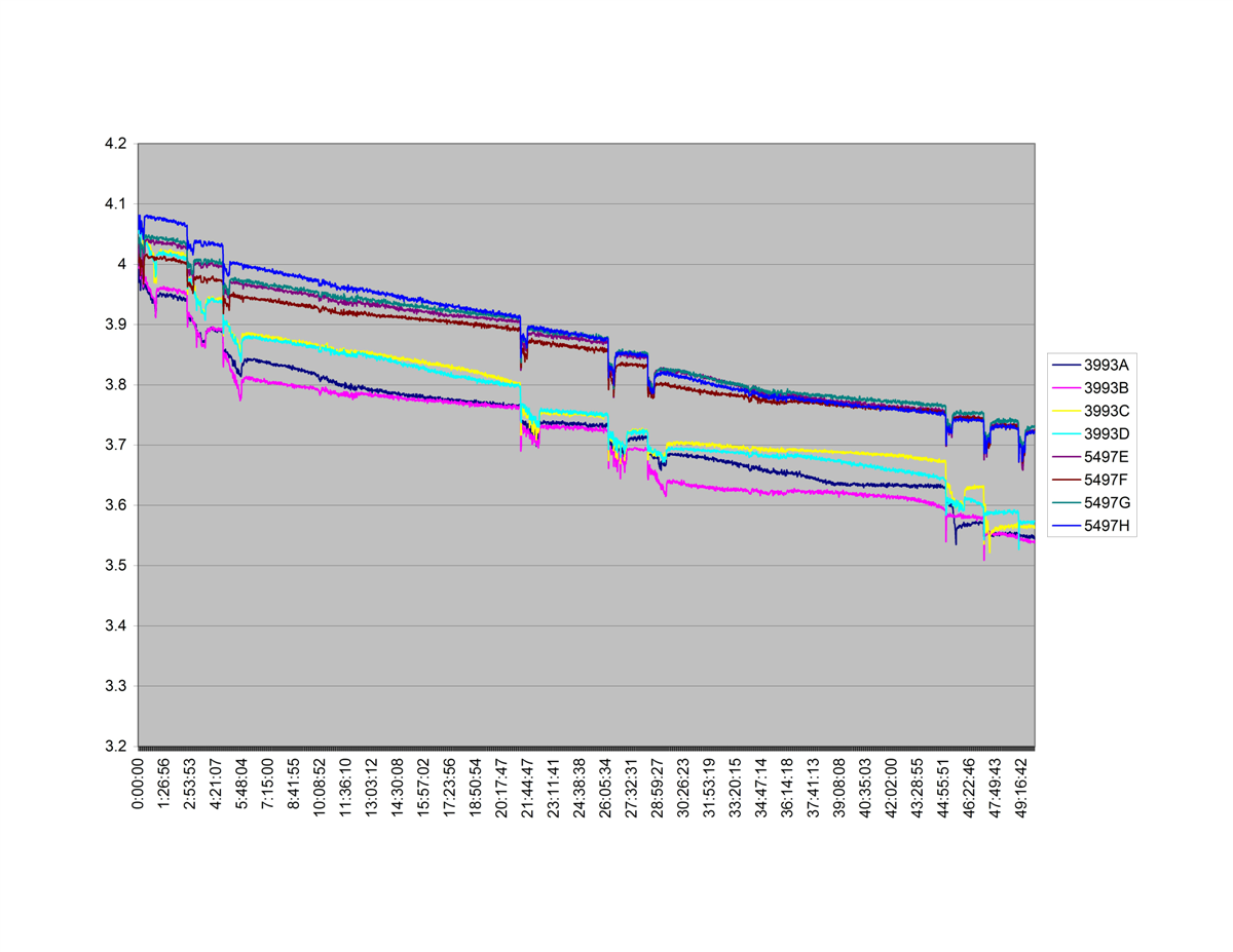 Excel file is 40mb. A little more information. I started this test at 6pm on 4/17, I measured each battery (and labeled them) with the fluke meter: controller A battery 3 (4.093 fluke) controller B battery 5 (4.190 fluke) controller C battery 6 (4.098 fluke) controller D battery 7 (4.165 fluke) controller E battery 8 (4.129 fluke) controller F battery 9 (4.126 fluke) controller G battery 10 (4.174 fluke) controller H battery 11 (4.034 fluke) 1pm today here is the status of each Controller: A turns on, displays charge me! B turns on, 50% C turns on, 50% D turns on, 25% E won't turn on F won't turn on G turns on, 10-25% H won't turn on Controllers A through D are r3993, Controllers E through H are r4824.