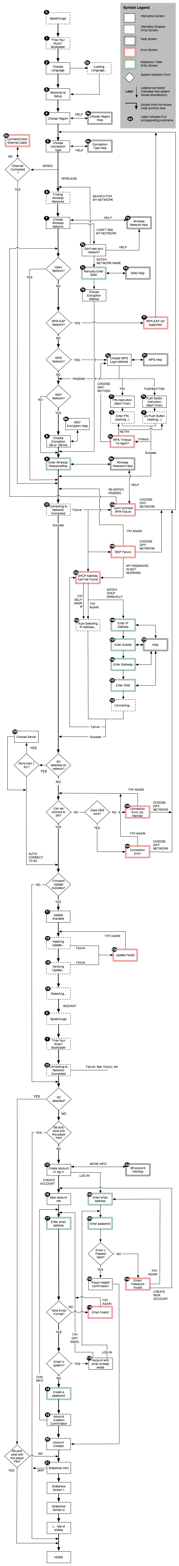 Created attachment 5120 [details] proposed setup flow including SC bypass Proposed flow attached. Only 1 new screen required (total), and that's to accomodate an edge case. Two parts: pre-firmware upgrade (between screens 10 and 11). If SC is detected, we connect to that automatically, and use SC to check for firmware updates instead of SN (I'm assuming this is plausible since this works fairly well already for other players) One new screen is needed (10k), only presented if there are multiple Squeezecenters detected on the network, in which case we need to ask the user which one to connect to. This is definitely a power-user feature, so I'm not super-worried about help screens or flowery language here. Copy: Choose Squeezebox Software -------------------------- [computer name 1] [computer name 2] [etc.] As per Richard's concerns: "If SCs are detected then it could be possible that fab4 skips registration and just displays the home screen (after loading the available menu options from all the SCs)." Yes. However, if the user already has an SN account, which will be the majority of the time (especially with 8.0 SC, which will push you really hard to enter SN account credentials upon install), registration won't be needed anyway. So this is fine. As for the obvious UI bugs this resents, see below. "Then from My Music they will be able to browse music on those servers. the problem comes when all those servers are turned off, then a "register" option will somehow need to be available." We'd probably have to accomodate this case anyway, in case a user disconnects the player from SN, etc. We can re-use the "sign in or create account" flow when fab4 tries to connect to SN without account credentials. "It's also a problem if the different SCs are registered to different SN accounts." If we prompt the user to choose which SC to connect to, this problem goes away. And we're getting into super-duper-power user territory here anyway (existing SB owner with at least 2 SCs running, each with different SN accounts!!!) Also agree Mickey's comment makes no sense. --------------------- I seriously think this flow works pretty well. First-time SB owners will have zero clue this exists, because they won't have SC 99.9 percent of the time. Previous owners with SC running will have the easiest setup of all time. I was averse to introducing weird cases here, but we'd probably have to (or already have previously) deal with non-SN-connection/account bugs anyway in time for release. If we deal with those well we're fine IMHO.