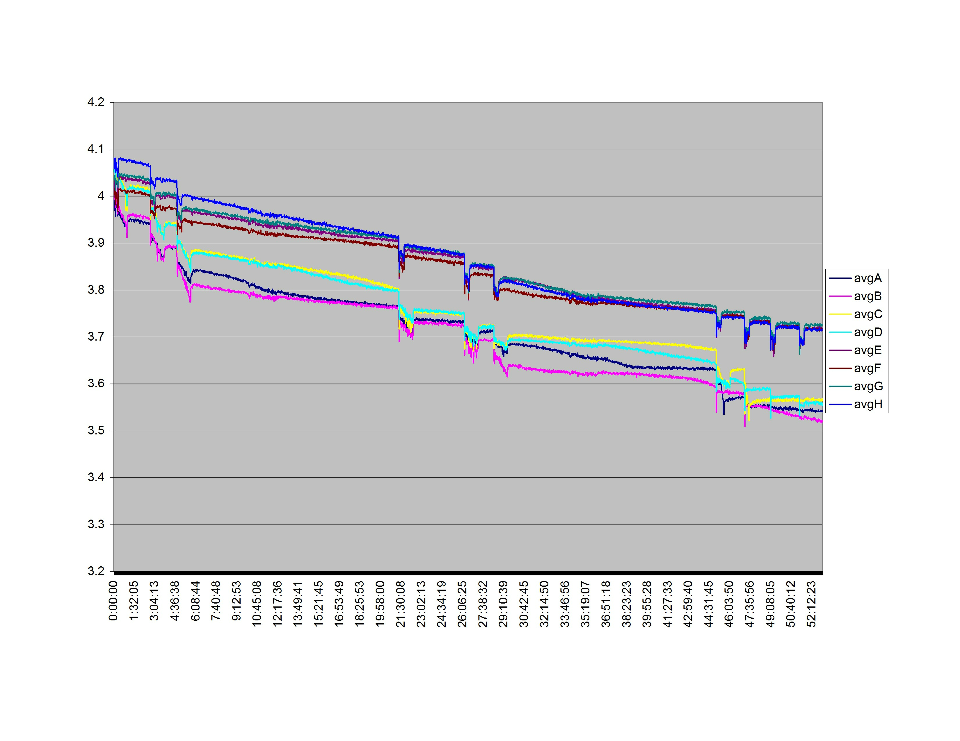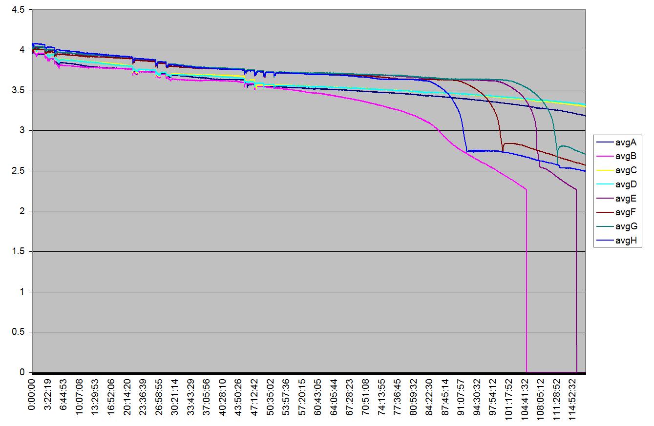 More clarification: at 3.7v the Controller won't turn on any more, as measured by the DLPIO8 that can show up as around 3.65v. So when the graph hits 3.65 the Controller is no longer usable. Also the first 4 Controllers are 3993 firmware, second 4 are 5497.