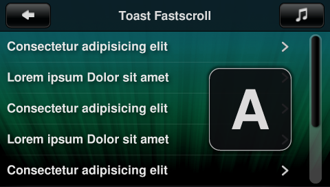 the fast scroll letter is delivered at the menu level: s.menu = { position = LAYOUT_CENTER, padding = { 0, 0, 0, 0 }, itemHeight = FIVE_ITEM_HEIGHT, fg = {0xbb, 0xbb, 0xbb }, font = _boldfont(250), } currently background treatments and positioning of the large text fastscroll letter are not supported at the menu level. Needs support at the C level to conform to UI design
