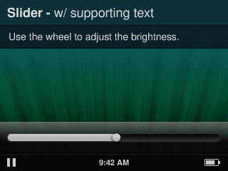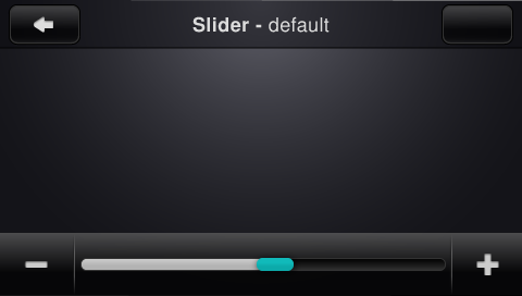 Created attachment 5782 [details] Ref artwork - slider (touch) Please note that the current implementation on device is not accurate. Due to the 'dead' zone at the bottom of the screen the entire bar was extended. 1. Need to extend bar ht - 58px 2. Need to add vert. divider lines 3. Fix asset issues for slider (left shadow tiling) ... 4. Implement numeric feedback (later - pending direction/location) -ex. 1-100 5. If we need additional assets for the L/R buttons let me know. The default should be minus "-" and plus "+"