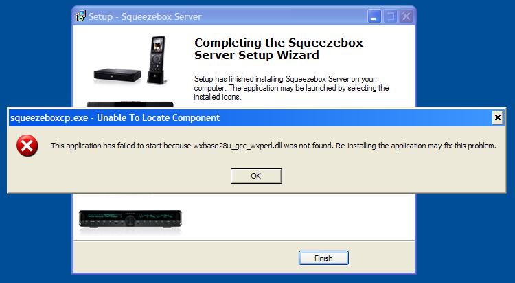 After a standard auto-update at the end of setup squeezeboxcp.exe crashed with this error: "This application has failed to start because wxbase28u_gcc_wxperl.dll was not found. Re-installing the application may fix this problem." Sorry, not sure what version I was updating from or to. It updated twice today so it's unclear. System info: Win XP SP2