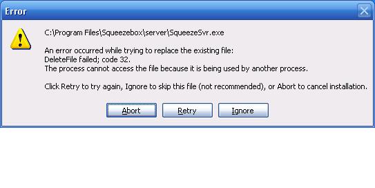 Created attachment 5352 [details] print screen of the error message Windows XP MCE sp3 Running SbS as a service under different user id Downloaded nightly Did NOT stop SbS service Started Install and answered prompts. Recieved error about Server\SqueezeSvr.exe being in use so it cannot be changed. It (and any other SbS piece other than the 2 install programs don't seem to be running in the Windows Task Manager. Retry resulted in the same error message on the same file.