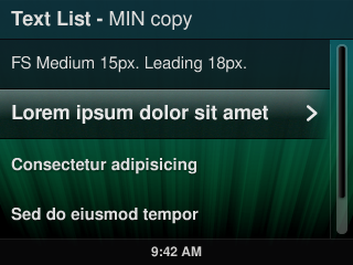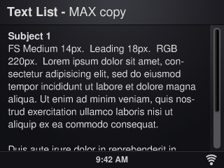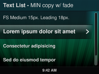 I'm confused by your statement: Dean, the only modification is that the assets will not go beneath the scroll bar. The reason being on touch the selection menu bar needs to be isolated from the sbar area. We found during beta testing that users were selecting near the arrow, thus the scrollbar and menu selection bar cannot overlap. Posting screen comp for reference... -------- The layer order is a side effect of the way we want it to look and if the arrows are too close to the scroll bar, then a overlay vs fade doesn't really matter. I'm disappointed with the fade effect as rendered here. It visually takes up too much space, and looks cobbled on. Can you show the same three screens with no fade (i.e. scroll bar over flat darkened area) and with a narrower width fade?