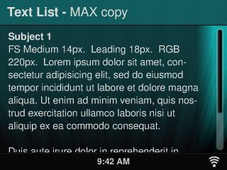 Sorry this posting was moved off-line via email. Dean and I looked at several options to treat the right edge. The final decision was to use a fade edge (2 tile asset) for the drop down. Dean, the only modification is that the assets will not go beneath the scroll bar. The reason being on touch the selection menu bar needs to be isolated from the sbar area. We found during beta testing that users were selecting near the arrow, thus the scrollbar and menu selection bar cannot overlap. Posting screen comp for reference...