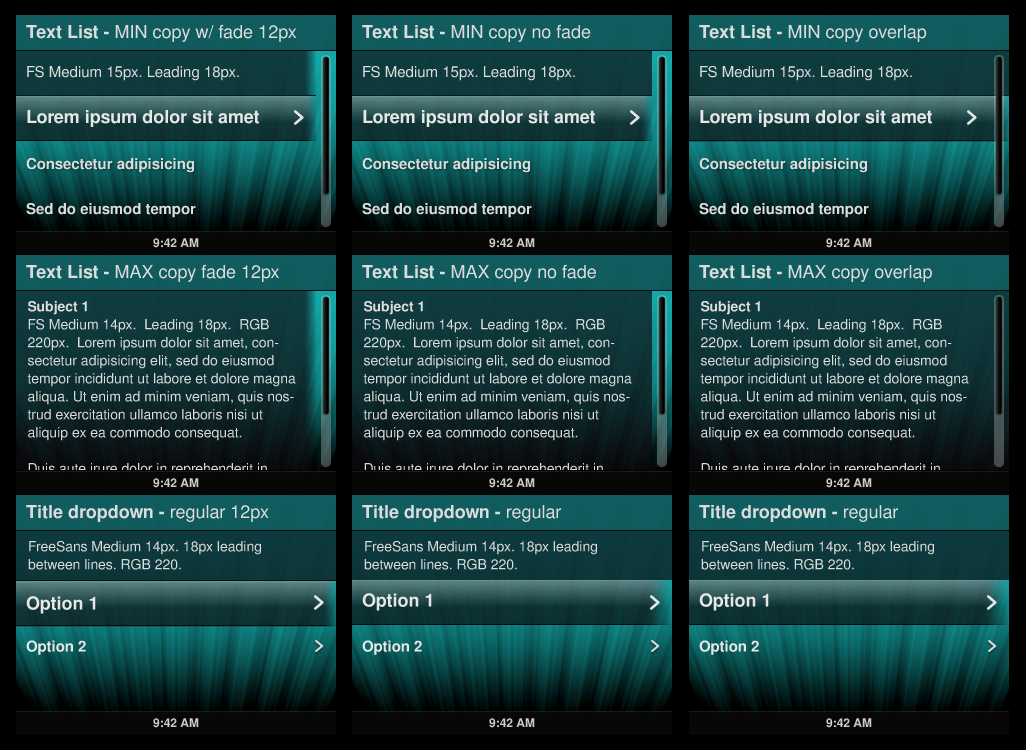 The fade when applied to the right edge of the dropdown is distracting. It becomes the highest point of contrast on screen and draws unwanted attention away from the content. For Baby/Jive I have concerns how the LCD with render the gradient. My fear is that it will render 'dirty' and not a true fade...