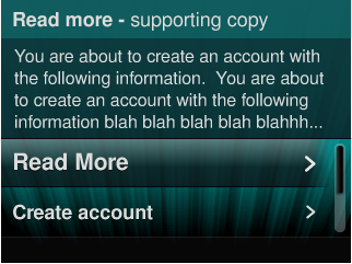 Created attachment 5540 [details] Ref artwork - "read more" feature proposal Placeholder solution for long supporting text and 1+ menu options. Truncating the text... allows for at least 1-2 menu options visible on screen at all times. 2 menu option height (90px) for Baby would be MAX space allowed for dropdown. Text would be centered vertically inside dropdown. Read more option would take user into "info window" similar to more help.