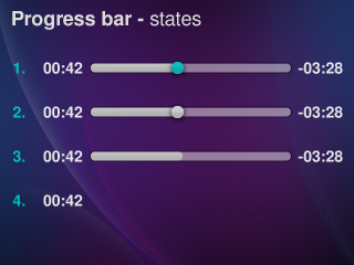 Depending on context: 1. Teal dot (w/ progress bar fill)- means track can be dragged/touched (can seek) 2. Off White dot (w/ progress bar fill) - indicator of position in time (can seek) 3. No dot (w/ progress bar fill) - elapsed time/time remaining (cannot seek) 4. Elapsed time (no bar)