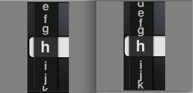 Created attachment 5489 [details] comparison with current textinput ref screen On the left is the current textinput ref screen, on the right is what I've done to get as close as possible to the ref screen. What I've done: - made the textinput horizontal bar the correct height - tweaked the y offset of the selected char to center vertically inside the bar as good as currently possible. What I haven't done: - the spacing of the chars in the vertical bar in the ref screen doesn't work as you scroll down further in the alphabet (e.g., the g ends up bleeding into the horizontal bar when it's just above the selected character). By having that a bit larger (25px), it works better throughout.