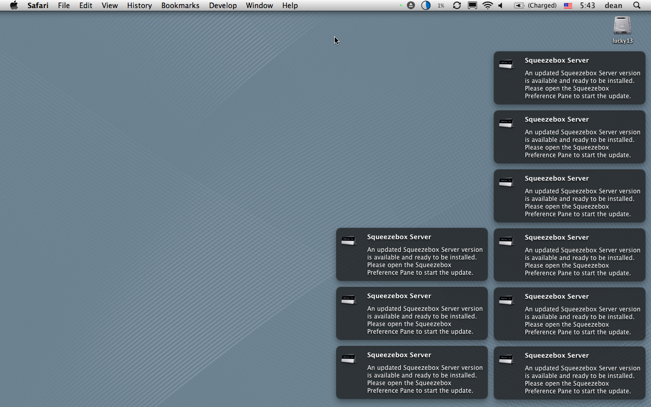 Created attachment 5465 [details] Lotsa growl notifications. I awoke this morning to the attached screen. Also, I would rewrite the text in the notification thusly: An updated version of Squeezebox Server is available and ready to install. Visit the Squeezebox Server in System Preferences to start the upgrade.
