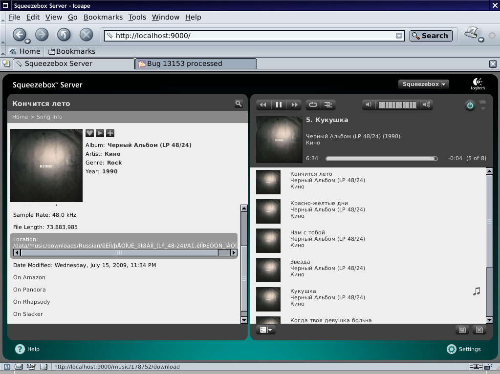 Ok, I've lost the hope to have it fixed in a reasonable time and decided to dive into code by myself. So here is what's happening: Slim::Music::Info::fileName() at the end does return Slim::Utils::Unicode::utf8decode_locale($j); which calls Encode::decode() and converts fileName from koi8 to internal perl string form at the same time Slim::Music::Info::sortFilename() does Slim::Utils::Unicode::utf8encode_locale( fileName($_) ) which seems to be reasonable, but utf8encode_locale ends up calling utf8on() which tries to convert from UTF-8 to internal perl representation _again_, and that's exactly where it fails. For now I've just commented out utf8on call in utf8encode_locale, which fixed the issue for me.