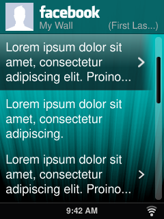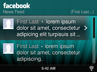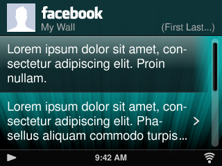 2 parts to this I think: ------ 1. - "Stacked" title bars for select apps. I believe Noah has had assets and guidelines for this in SVN for a while. The idea is that on facebook and other "well-branded" apps (Pandora, Rhapsody, last.fm, flickr, SIRIUS, etc - forget the exact full list, but it should be in the asset set), we use a different treatment for the title bar (see "news feed" attachments). There are 2 minor variations to this title bar. a - On the "app description" page (in the app gallery - the screen with the long description and "install facebook" option etc) and on the "home screen" of these apps, this title bar is standard height, but you substitute in the graphic asset instead of the usual text-based title. b - On almost all other screens inside the app (i.e. screens under the home menu), you use the title bar treatment shown in the "news feed" attachment above. This type of title bar is taller than normal (see reference for exact height) with a 2-line display. The top left corner shows the app logo, the bottom left corner shows the name of the current menu, and the bottom right area shows the user's name/username/email (whatever is appropriate for the service, in this case facebook would show your First name and Last name.) (The username bit is a nice-to-have but not strictly required for 7.4). ------ 2. News Feed + Walls The News Feed has the title bar type discussed in "1-b" above. Each line item is the same height (82px I think, refer to the guides in SVN). Each post in the news feed displays the following: - profile pic of that person (standard icon size) - first and last name of the user - the "dot" separator we're using for album/track titles on now playing - the text of the post. (the top line breaks on the "jive" version are coincidental) If the text from the post is truncated, then: - we should truncate gracefully if we can (...) and make that item selectable. - if the item is pressed, the user is taken to a screen with the full text of the post. - Comments should NOT be supported in this version. That requires more design work, and I'd strongly prefer to add that functionality only when we get time to do it right.