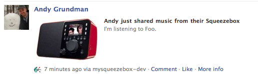 Based on the fields we have at our disposal in the body of the attachment attribute, we should display the following on Facebook.com: Title (in bold): FirstName just shared music from their Squeezebox Source: www.mysqueezebox.com Caption: None/Do not use Description: "I'm listening to [song]/[album] by [artist]." Image: Image/icon of the Squeezebox player model they were playing music from. If necessary, we could defer display of the image as a post-launch enhancement.