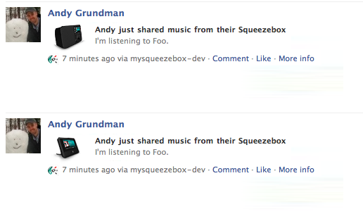Just got some feedback from the tester at Facebook. I'm going to open a new bug re most of the enhancements they have suggested_that we make. However, they've seen one issue that looks like a possible show stopper. Here's what they had to say: "When trying to "Share this [current song] on Facebook", after selecting the story type, an error is returned (code 100: img objects must have valid 'src' and 'href' attributes)." Have we seen this issue? If so, can we try to resolve this one today? They are waiting on this before pushing their legal team to sign the auth.login/Extended API agreement... Also, here are a few other bits of feedback that would be pretty nice to address before launch if possible: - Sometimes the screensaver isn't able to start and displays an error. - Sometimes the screensaver displays a generic FB dude image. Not totally sure why but should be preventable. - If there are no comments for a given story, you probably shouldn't show the "(0)". - Is there any way to have the detail view (when you click into a story) scroll vertically? The scrolling text is kinda crazy. - For comments, please show the person's name first (not last). - Context menu should say "Share on Facebook" not "Share this on Facebook" They had more items, but they are either not particularly important or seem like a lot of work. Like I said, I'll open a separate bug for those and target for 8.0 (or 7.5 or whatever we're calling the Fab4 release).