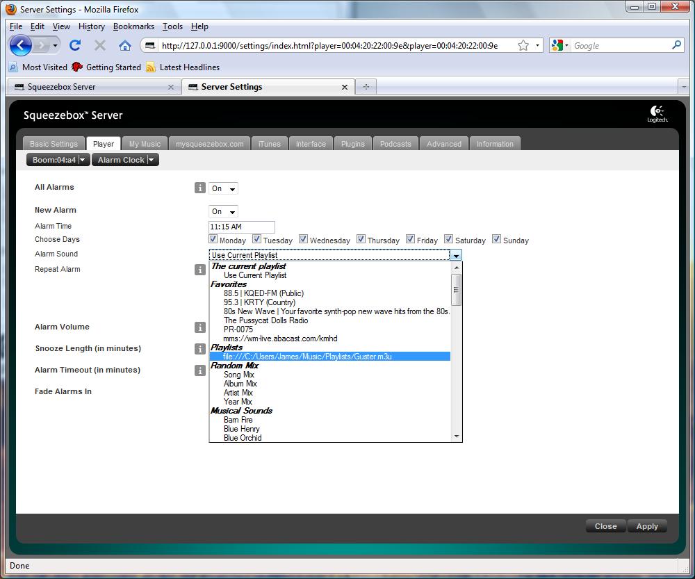 When using a playlist in an alarm for Alarm Sound at some point in time instead of the 'nice name' it starts pointing to a file:/// name. The original 'nice name' playlist entry is no longer present and in the list of playlists at the end are present the file:// playlists. It seems to happen for all playlists that are involved in an alarm. Example: original playlist nice name: Oakenfold, Paul - Another World - Disc 1 now appears: file:///c/media/music/Oakenfole,%20Paul/Another%20World/Disc%201/ actual playlist: /c/media/music/Oakenfold, Paul/Another World/Disc 1/Oakenfold, Paul - Another World - Disc 1.m3u