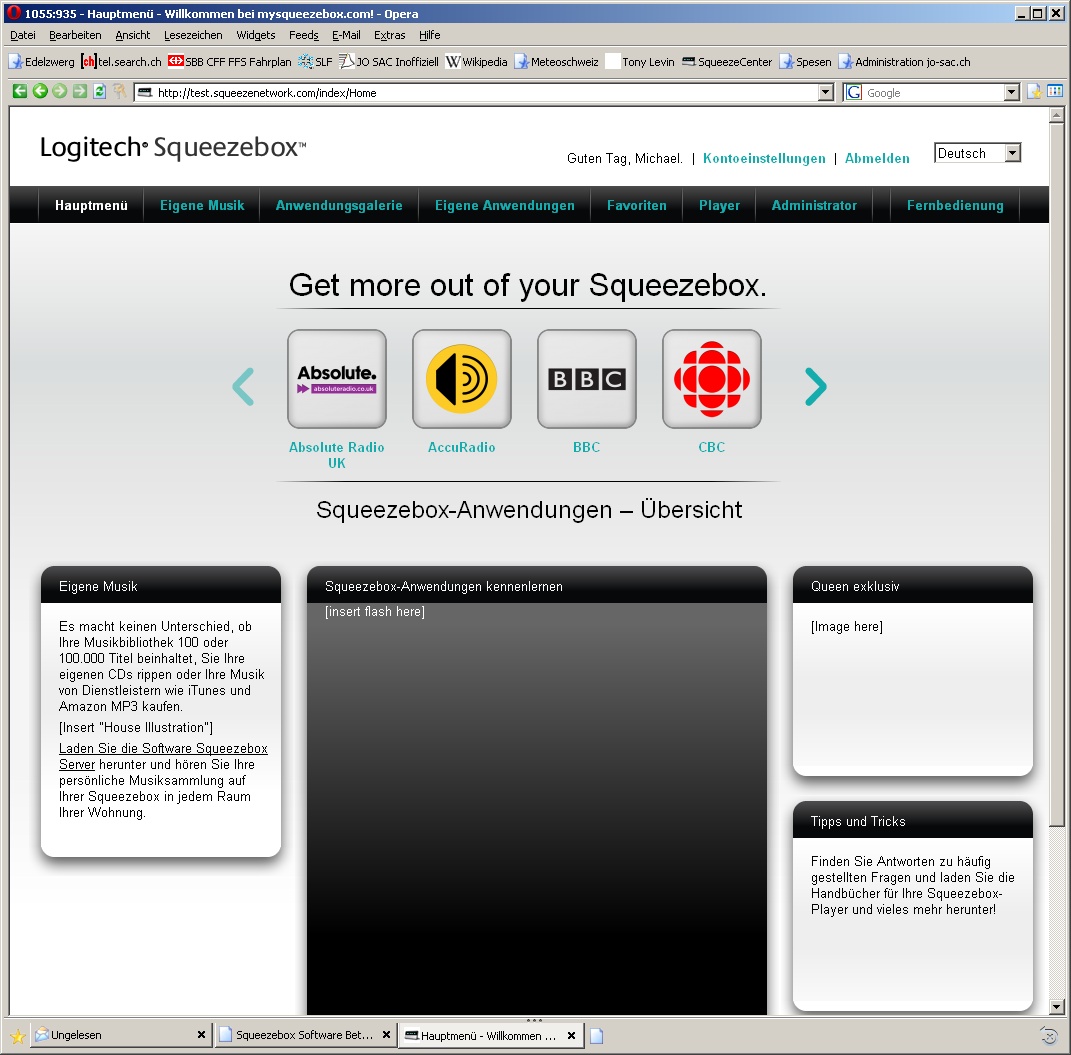 OK, both the homepage slideshow and the left box should now show content. "My Music" should be fully localized. "Discovering Squeezebox Apps" should show localized title, but non-localized slideshow text.