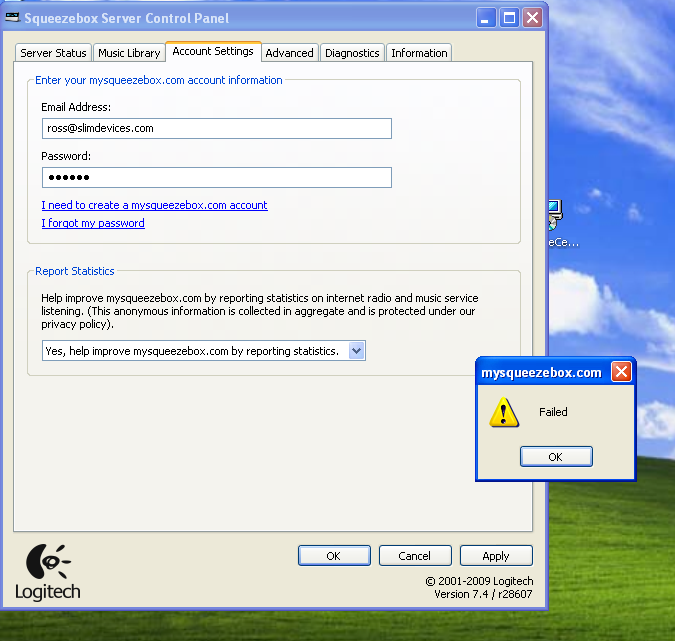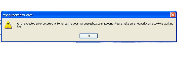 == Auto-comment from SVN commit #28799 to the slim repo by michael == == https://svn.slimdevices.com/slim?view=revision&revision=28799 == Fixed Bug: 14637 +1 Description: give reasonable feedback when SN account validation fails due to networking issues