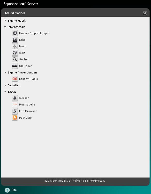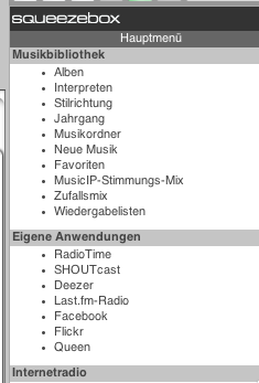 I am using the standard skin and I am referring to the "Anwendungsgalerie" item, not the "Eigene Anwendungen" item. As you can see on the attached screenshot there is just "Eigene Anwendungen" in my web ui. On my squeezebox I see additionally "Anwendungsgalerie" containing items like facebook, Queen, Deezer, e.t.c. As far as I remember these things were available in the web ui of Squeezecenter 7.3.3.