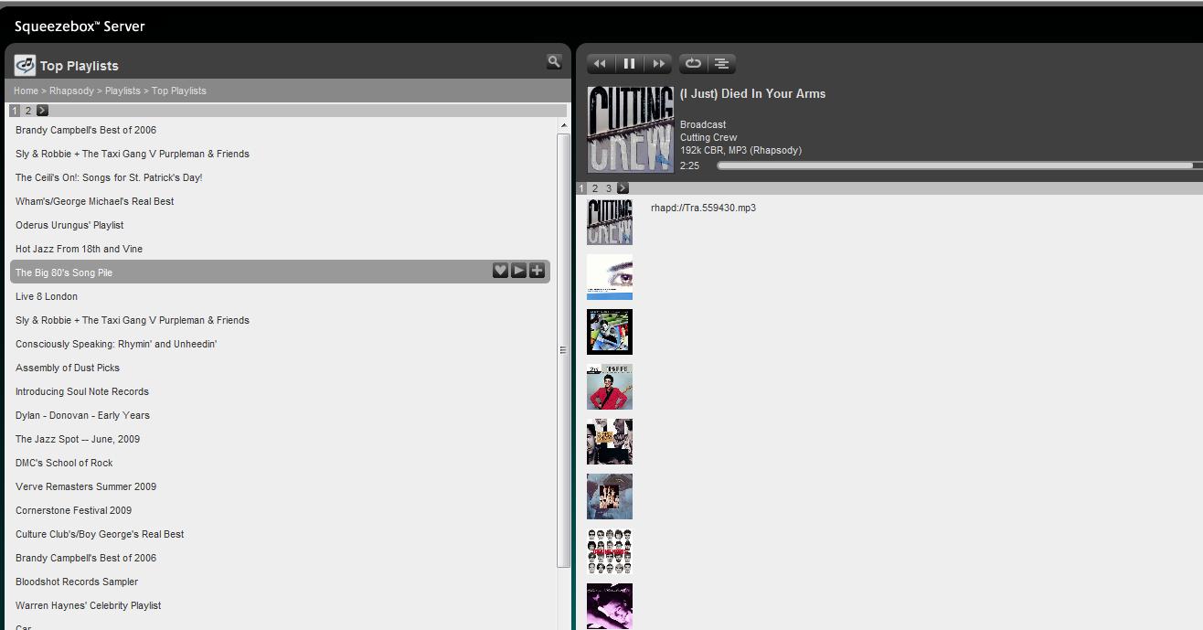I'm not seeing an error here that triggers when it happens. I did get the following error, but I think it's unrelated: [09-10-18 12:30:15.8580] Slim::Schema::Storage::throw_exception (82) Error: DBI Exception: DBD::mysql::st execute failed: MySQL server has gone away [for Statement "SELECT me.name, me.value FROM metainformation me WHERE ( name = ? )"] [09-10-18 12:30:15.8587] Slim::Schema::Storage::throw_exception (82) Backtrace: frame 0: Slim::Utils::Log::logBacktrace (/usr/share/perl5/Slim/Schema/Storage.pm line 82) frame 1: Slim::Schema::Storage::throw_exception (/usr/share/squeezeboxserver/CPAN/DBIx/Class/Storage/DBI.pm line 957) frame 2: DBIx::Class::Storage::DBI::__ANON__ (/usr/share/squeezeboxserver/CPAN/DBIx/Class/Storage/DBI.pm line 1217) frame 3: DBIx::Class::Storage::DBI::_dbh_execute (/usr/share/squeezeboxserver/CPAN/DBIx/Class/Storage/DBI.pm line 547) frame 4: (eval) (/usr/share/squeezeboxserver/CPAN/DBIx/Class/Storage/DBI.pm line 540) frame 5: DBIx::Class::Storage::DBI::dbh_do (/usr/share/squeezeboxserver/CPAN/DBIx/Class/Storage/DBI.pm line 1227) frame 6: DBIx::Class::Storage::DBI::_execute (/usr/share/squeezeboxserver/CPAN/DBIx/Class/Storage/DBI.pm line 1451) frame 7: DBIx::Class::Storage::DBI::_select (/usr/share/squeezeboxserver/CPAN/DBIx/Class/Storage/DBI.pm line 1905) frame 8: DBIx::Class::Storage::DBI::select_single (/usr/share/squeezeboxserver/CPAN/DBIx/Class/ResultSet.pm line 740) frame 9: DBIx::Class::ResultSet::single (/usr/share/perl5/Slim/Schema.pm line 585) frame 10: Slim::Schema::single (/usr/share/perl5/Slim/Music/Import.pm line 725) frame 11: Slim::Music::Import::stillScanning (/usr/share/perl5/Slim/Web/Pages/Common.pm line 60) frame 12: Slim::Web::Pages::Common::addLibraryStats (/usr/share/perl5/Slim/Web/Pages/Home.pm line 206) frame 13: Slim::Web::Pages::Home::home (/usr/share/perl5/Slim/Web/Pages/Home.pm line 29) frame 14: Slim::Web::Pages::Home::__ANON__ (/usr/share/perl5/Slim/Web/HTTP.pm line 1086) frame 15: Slim::Web::HTTP::generateHTTPResponse (/usr/share/perl5/Slim/Web/HTTP.pm line 913) frame 16: Slim::Web::HTTP::processURL (/usr/share/perl5/Slim/Web/HTTP.pm line 724) frame 17: Slim::Web::HTTP::processHTTP (/usr/share/perl5/Slim/Networking/IO/Select.pm line 133) frame 18: (eval) (/usr/share/perl5/Slim/Networking/IO/Select.pm line 119) frame 19: Slim::Networking::IO::Select::__ANON__ (/usr/share/perl5/Slim/Networking/IO/Select.pm line 177) frame 20: (eval) (/usr/share/perl5/Slim/Networking/IO/Select.pm line 177) frame 21: Slim::Networking::IO::Select::loop (/usr/sbin/squeezeboxserver line 620) frame 22: main::idle (/usr/sbin/squeezeboxserver line 574) frame 23: main::main (/usr/sbin/squeezeboxserver line 1103) Should I test with debug on?