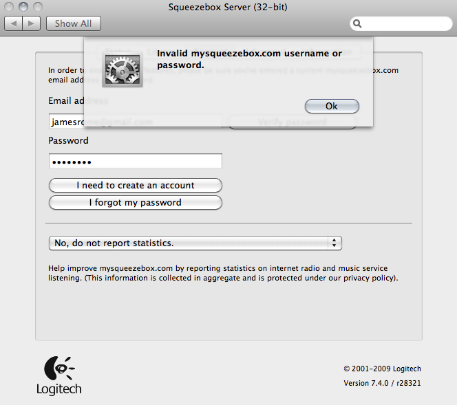 I emptied the log. Then I tried the login in both System Preferences, and on the Web page. No logs. Then I enables logging for mysqueezebox.com and get: server.log [09-10-23 11:28:21.3087] Slim::Networking::SqueezeNetwork::Players::_players_done (104) Got list of SN players: ( [], [ { apps => { accuradio => { home_menu => 0, icon => "/static/images/icons/accuradio.png", title => "RADIO_PROVIDERS_ACCURADIO", type => "opml", url => "http://www.accuradio.com/shoutcast/accuradio.opml", }, bbc => { home_menu => 0, icon => "/static/images/icons/bbc.png", title => "RADIO_PROVIDERS_BBC", type => "opml", url => "http://www.slimdevices.com/picks/split/BBC.opml", }, cbc => { home_menu => 0, icon => "/static/images/icons/cbc.png", title => "RADIO_PROVIDERS_CBC", type => "opml", url => "http://www.cbc.ca/radio2/opml/CBC.opml", }, classical => { home_menu => 0, icon => "/static/images/icons/classical.png", plugin => "Slim::Plugin::Classical::Plugin", title => "CLASSICAL", type => "opml", url => "/api/classical/v1/opml", }, live365 => { home_menu => 0, icon => "/static/images/icons/live365.png", plugin => "Slim::Plugin::Live365::Plugin", title => "PLUGIN_LIVE365_MODULE_NAME", type => "opml", url => "/api/live365/v1/opml", }, pandora => { home_menu => 0, icon => "/static/images/icons/pandora.png", plugin => "Slim::Plugin::Pandora::Plugin", title => "PANDORA", type => "opml", url => "/api/pandora/v1/opml", }, radioio => { home_menu => 0, icon => "/static/images/icons/radioio.png", title => "RADIOIO", type => "opml", url => "/api/radioio/v1/opml", }, }, id => 1123, mac => "00:04:20:05:b8:25", model => "squeezebox2", name => "bedroom", uuid => undef, }, { apps => { accuradio => { home_menu => 0, icon => "/static/images/icons/accuradio.png", title => "RADIO_PROVIDERS_ACCURADIO", type => "opml", url => "http://www.accuradio.com/shoutcast/accuradio.opml", }, bbc => { home_menu => 0, icon => "/static/images/icons/bbc.png", title => "RADIO_PROVIDERS_BBC", type => "opml", url => "http://www.slimdevices.com/picks/split/BBC.opml", }, cbc => { home_menu => 0, icon => "/static/images/icons/cbc.png", title => "RADIO_PROVIDERS_CBC", type => "opml", url => "http://www.cbc.ca/radio2/opml/CBC.opml", }, classical => { home_menu => 0, icon => "/static/images/icons/classical.png", plugin => "Slim::Plugin::Classical::Plugin", title => "CLASSICAL", type => "opml", url => "/api/classical/v1/opml", }, live365 => { home_menu => 0, icon => "/static/images/icons/live365.png", plugin => "Slim::Plugin::Live365::Plugin", title => "PLUGIN_LIVE365_MODULE_NAME", type => "opml", url => "/api/live365/v1/opml", }, pandora => { home_menu => 0, icon => "/static/images/icons/pandora.png", plugin => "Slim::Plugin::Pandora::Plugin", title => "PANDORA", type => "opml", url => "/api/pandora/v1/opml", }, radioio => { home_menu => 0, icon => "/static/images/icons/radioio.png", title => "RADIOIO", type => "opml", url => "/api/radioio/v1/opml", }, }, id => 183_892, mac => "00:04:20:1a:2a:28", model => "squeezeplay", name => "Controller", uuid => "9bd5ca8649c73e99902e4a08dd1980ec", }, { apps => { accuradio => { home_menu => 0, icon => "/static/images/icons/accuradio.png", title => "RADIO_PROVIDERS_ACCURADIO", type => "opml", url => "http://www.accuradio.com/shoutcast/accuradio.opml", }, bbc => { home_menu => 0, icon => "/static/images/icons/bbc.png", title => "RADIO_PROVIDERS_BBC", type => "opml", url => "http://www.slimdevices.com/picks/split/BBC.opml", }, cbc => { home_menu => 0, icon => "/static/images/icons/cbc.png", title => "RADIO_PROVIDERS_CBC", type => "opml", url => "http://www.cbc.ca/radio2/opml/CBC.opml", }, classical => { home_menu => 0, icon => "/static/images/icons/classical.png", plugin => "Slim::Plugin::Classical::Plugin", title => "CLASSICAL", type => "opml", url => "/api/classical/v1/opml", }, live365 => { home_menu => 0, icon => "/static/images/icons/live365.png", plugin => "Slim::Plugin::Live365::Plugin", title => "PLUGIN_LIVE365_MODULE_NAME", type => "opml", url => "/api/live365/v1/opml", }, pandora => { home_menu => 0, icon => "/static/images/icons/pandora.png", plugin => "Slim::Plugin::Pandora::Plugin", title => "PANDORA", type => "opml", url => "/api/pandora/v1/opml", }, radioio => { home_menu => 0, icon => "/static/images/icons/radioio.png", title => "RADIOIO", type => "opml", url => "/api/radioio/v1/opml", }, }, id => 42_330, mac => "00:04:20:07:1d:9d", model => undef, name => "HiFi", uuid => undef, }, { apps => { accuradio => { home_menu => 0, icon => "/static/images/icons/accuradio.png", title => "RADIO_PROVIDERS_ACCURADIO", type => "opml", url => "http://www.accuradio.com/shoutcast/accuradio.opml", }, bbc => { home_menu => 0, icon => "/static/images/icons/bbc.png", title => "RADIO_PROVIDERS_BBC", type => "opml", url => "http://www.slimdevices.com/picks/split/BBC.opml", }, cbc => { home_menu => 0, icon => "/static/images/icons/cbc.png", title => "RADIO_PROVIDERS_CBC", type => "opml", url => "http://www.cbc.ca/radio2/opml/CBC.opml", }, classical => { home_menu => 0, icon => "/static/images/icons/classical.png", plugin => "Slim::Plugin::Classical::Plugin", title => "CLASSICAL", type => "opml", url => "/api/classical/v1/opml", }, live365 => { home_menu => 0, icon => "/static/images/icons/live365.png", plugin => "Slim::Plugin::Live365::Plugin", title => "PLUGIN_LIVE365_MODULE_NAME", type => "opml", url => "/api/live365/v1/opml", }, pandora => { home_menu => 0, icon => "/static/images/icons/pandora.png", plugin => "Slim::Plugin::Pandora::Plugin", title => "PANDORA", type => "opml", url => "/api/pandora/v1/opml", }, radioio => { home_menu => 0, icon => "/static/images/icons/radioio.png", title => "RADIOIO", type => "opml", url => "/api/radioio/v1/opml", }, }, id => 65_396, mac => "3b:02:a5:9e:b7:75", model => undef, name => "SoftSqueeze", uuid => undef, }, ], ) [09-10-23 11:28:21.3094] Slim::Networking::SqueezeNetwork::Players::_players_done (105) Got list of active services: { deezer => 0, facebook => 0, lfm => 0, napster => 0, 