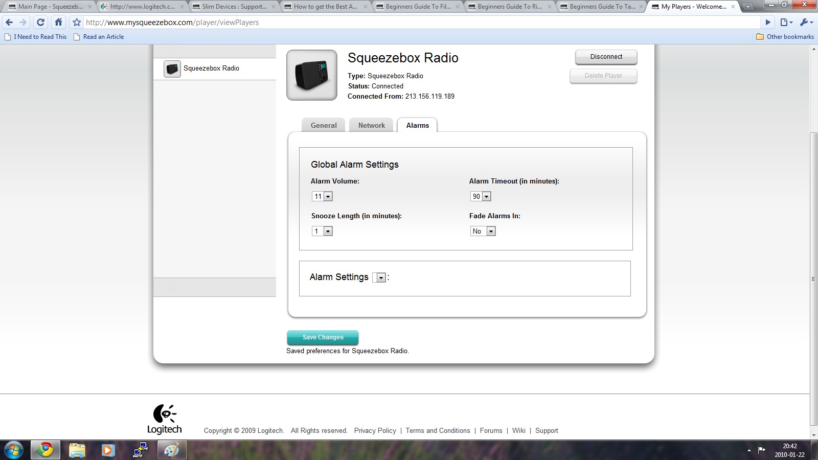 Created attachment 6453 [details] Screenshot of the broken "Alarms" tab. I'm using SB Radio 7.4.2-r8355 connected to MySB, but as far as I remember, I did see this bug with 7.4.1. Whenever I change my alarm settings (add/remove/edit) on my SqueezeBox Radio, everything seems to be properly reflected on the Alarms tab on My Players page. But whenever I do any of the following: - add a new alarm via MySB, - edit an existing alarm via MySB that was previously added on my SB Radio the Alarms tab breaks (see attached image). I cannot add alarms anymore nor edit any of the existing ones. All the alarms are still visible on SB Radio. When I remove all the alarms from my SB Radio the Alarms tab starts to work properly. Still, the only thing I can do is to add one alaram (the UI breaks afterwards) or edit (only one, too) a previously added alaram on SB Radio. Tried both on Google Chrome 4 and IE 8.
