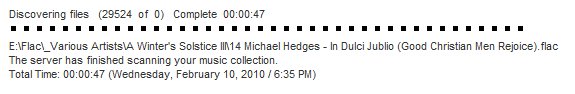 Created attachment 6758 [details] Progress displayed during a new & changed scan No, still seeing the same thing at r30558. This screen cap shows progress during a new & changed scan. Look at the line 'Discovering files' (the three lines above are left over from, I guess, the most recent clear & rescan run last night).