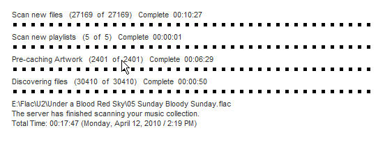 Created attachment 6509 [details] Screen capture following new & changed scan Here's another screen capture showing the correctly formatted time after the new & changed scan is finished. Another small problem shown in this capture is that after the scan, the last file scanned remains displayed. If you leave the page and return, this isn't shown any longer.