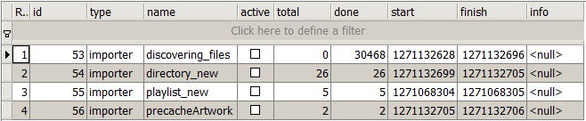 The existing code is sorting by start,id: my @progress = Slim::Schema->rs('Progress')->search( $args, { 'order_by' => 'start,id' } )->all; Looking at your snippet I see that the playlist scan is the oldest (judging from the start timestamp), which makes me think the table isn't wiped on new scans.