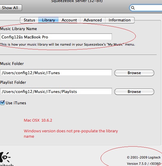 Created attachment 6635 [details] preferences pane, library tab on mac Mac OSX 10.6 and 10.5.8 1) Fresh install of SB server (7.5.0 r30360) 2) Go to SB preference pane, click on the 'library' tab 3) the field named 'Music Library Name' is pre-populated 4) The default name is User's MacBook Pro (where 'user' is the current user) 5) In the latest builds on mac, the apostrophe shows as the letter 'a' with a caret on top. > 6) The SB touch displays this name correctly, the boom does not. 7) The windows version does not provide a default name or pre-populate the fields 8)See attached screenshots