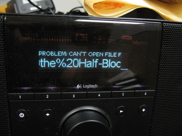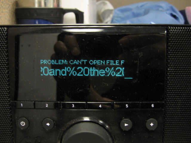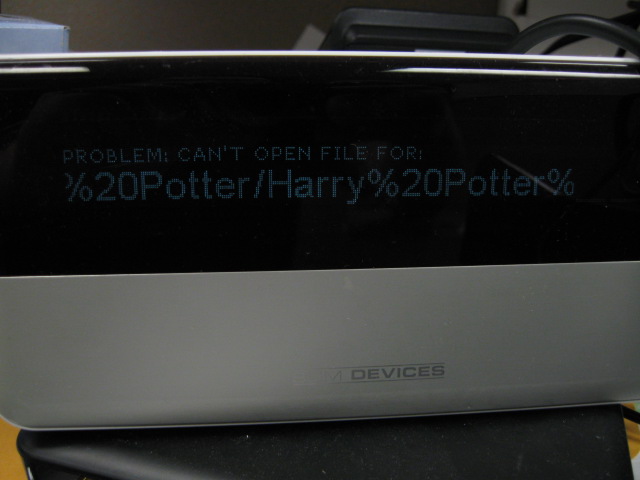 Watched this happen after 15 hours: 1. Two IP3K players in PROBLEM: CAN'T OPEN FILE FOR: state 2. 15 minutes later, another IP3K player has message on screen. 3. 15 minutes after that, Fab4 displays the generic "Having problems with ..." TinySC message. If you look at the the status screen, it's no longer running. Just lucky to see this sequence. May have happened before, but I would scratch my head and wonder why. This is with a Fab4/TinySC running version of firmware r8658. It's with 4 IP3K players (2 Boom, 2 SB3). Note that in this bug, one IP3K player did not encounter the CAN'T OPEN FILE issue. All players streaming MP3 files (Harry Potter Audio CD -- different book for each player). Also used WD 1.5TB USB self-powered drive, which was involved in bug 15915 and could be problematic in some way. The logs were useless since I turned on a bunch of wrong debug switches (UI). Enclosing photos of 3 players with the aforementioned error message.