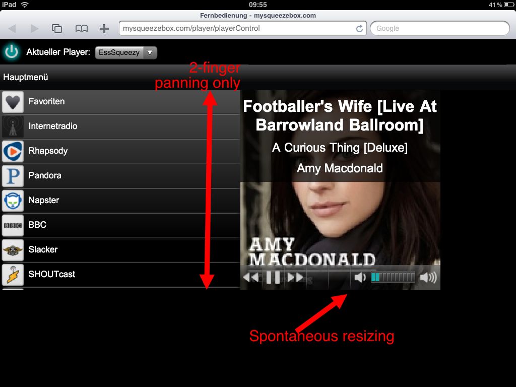 Created attachment 6763 [details] Web UI Default skin on iPad The Web UI doesn't really work on the iPad. Speed is not the issue - iPad's browser is very, very fast, but functionality is: 1. Some of the frames/divs that need scrolling need to be scrolled using two-finger panning. My experience with the old iPeng plugin is that 90% of the users will not even know that functionality so will think it doesn't scroll at all 2. The main menu - if unfolded - doesn't scroll at all 3. Sizing doesn't work correctly so that part of the page is cut off - including essential controls like access to settings. This is NOT just scrolled off-screen it's unavailable at all. 4. The Classic skin has a habit of "jumping" on the screen that is it spontaneously repositions itself after a few seconds. I have not been able to make out _where_ it positions itself to. MySB is less affected but the Apps menu also needs two-finger panning on the remote and the remote sometimes changes the size spontaneously I'll attach some screen shots.