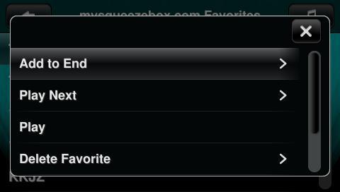 Created attachment 6821 [details] Screenshot of the Settings as they appear on Mysqueezebox.com When connected to Squeezebox server, and in the Favorites menu on a SqueezeOS based player, there is no option to Delete Favorites. In fact the Context menu only shows the Title and the URL. When connected to Mysqueezebox.com the options are more advanced, giving the following options: Add to End Play Next Play Delete Favorite Title URL There is currently no way to delete favorites from this menu when connected to Squeezebox Server. This does not appear to affect IP3K players.