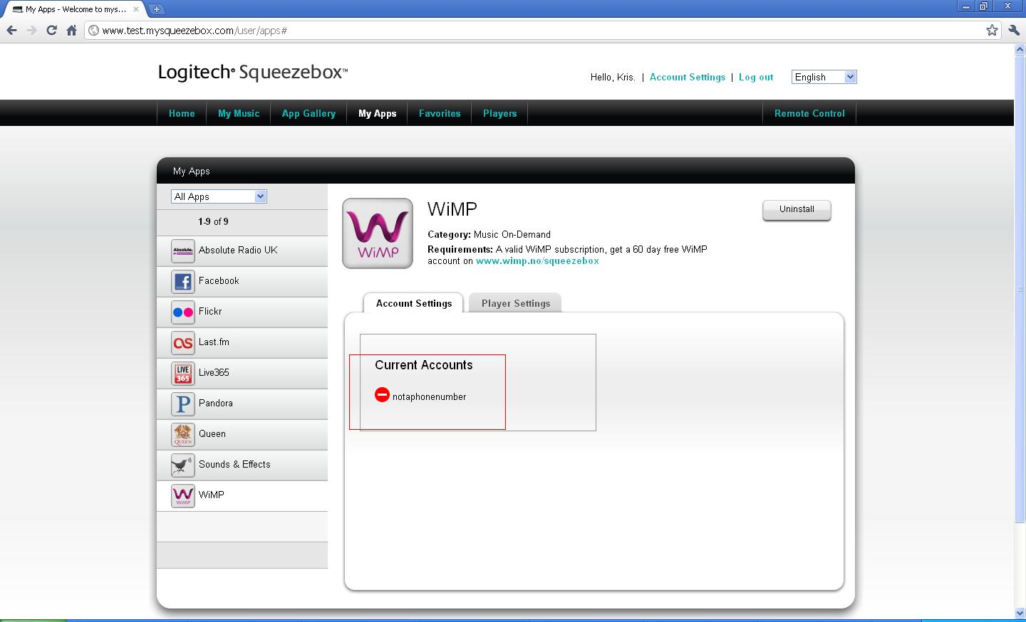 Created attachment 6972 [details] No account validation It would seem that the app doesn't check to verify that the account info being entered is correct, or even valid. I was able to "successfully add" a WiMP account both via mysqueezebox.com and Duet using completely bogus info and it "added" anyway. No error is encountered until the user gets all the way to a track he/she wants to play, at which time they will see an error message saying "Your were logged out because you logged into Wimp somewhere else". This is going to be very confusing for a customer who accidentally enters incorrect WiMP account info. They will really have no idea what's going wrong since the message they see simply says they logged in somewhere else.