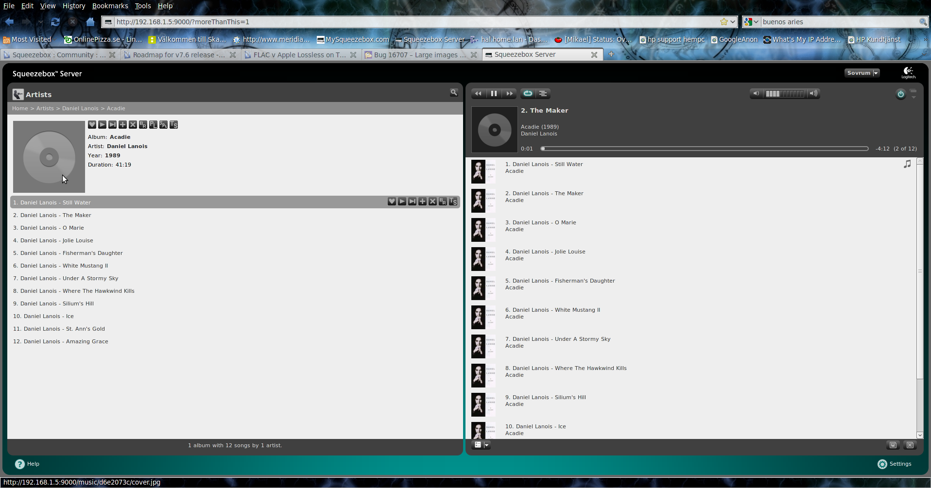 For some reason all "large artwork" with some of my flac's has disappeared. I see the smaller thumbs in all interfaces but the large ones are gone ? web-UI controller Touch or Radio . There is an 303*300 folder jpg in the albums directory. And every files has the same img embedded. One more person seas this he is on windows while I'm using linux see this tread. http://forums.slimdevices.com/showthread.php?t=83776 There seems to be no correlation re which ones gone ? Maybe they are old but I've used the same flac 1.2.1 since 2007 This is not that common in my collection, but you can see it on rare occasion. I don't know how frequently it is in Tamanaco's collection . Version: 7.6.0 - r31605 @ Wed Dec 8 03:01:49 MST 2010 Hostname: hal.home.lan Server IP Address: 192.168.1.5 Server HTTP Port Number: 9000 Operating system: Red Hat - EN - utf8 Platform Architecture: i686-linux Perl Version: 5.8.8 - i686-linux-thread-multi Database Version: DBD::SQLite 1.30_06 (sqlite 3.7.2) Total Players Recognized: 4