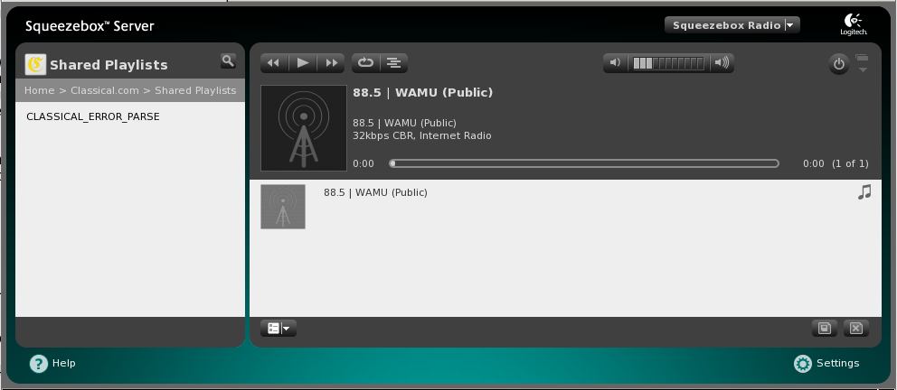 I'm describing behavior that I see using my squeezebox radio and also using my squeezebox server running debian gnu/Linux 6.0. Based on the small amount of debugging I've been able to do, I believe the problem is on the software that runs on mysqueezebox.com, which is why I have posted my bug on this product/component rather than against squeezebox server or squeezebox radio. If you feel that I have posted the bug in the wrong place, please feel free to move it or to ask me to post it elsewhere. Now the details... I registered for an account on classical.com and added the classical.com app in my mysqueezebox.com account. I created a couple of custom playlists, one called "howells" containing the Requiem by Herbert Howells and Tocatta by Einojuhani Rautavaara, and a second one called "qplay2" containing only the Rautavaara Tocatta, though those details are likely not important. From my squeezebox radio, when I navigate to the classical.com menu, I am able to see "Themed Playlists", "Shared Playlists", and "My Playlists". I can enter Themed Playlists with no problem, and most (but not all) of the playlists work fine. However, when I enter "Shared Playlists", I see "CLASSICAL_ERROR_PARSE" on my screen, and when I enter "My Playlists", I see the list of playlists I have created (indicating that the classical.com app is clearly seeing my account) but selecting any playlist also results in "CLASSICAL_ERROR_PARSE". It is not a problem with the playlists themselves since I am able to access them fine from the classical.com website, and it's not a problem with accessing my account since I am clearly able to see the names of the playlists I have created. I did a few minutes of debugging by looking at Classical/ProtocolHandler.pm on my squeezebox server but was only able to determine that the error is either generated by the software on mysqueezebox.com or possibly in parsing the response to something under http://www.mysqueezebox.com/api/classical/v1/opml. I see the problem whether I connect my Squeezebox radio directly to mysqueezebox.com or whether I connected it to my squeezebox server. Other relevant details: * software version: 7.5.3 r9283 * squeezebox radio model number: X-R0001 I'm attaching a screenshot of my using my squeezebox server on port 9000 to control my squeezebox radio and attempting to navigate to "Shared Playlists". I can also reproduce the problem with the "remote control" by connecting to mysqueezebox.com.