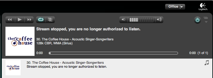 I don't see how Logitech Squeezebox can promote the fact that Sirius Radio works on the Squeezebox when the stream constantly stops and you get the error "Stream stopped, you are no longer authorized to listen." I checked to see if any of my other squeezeboxes are on (they weren't) or if I'm streaming from Sirius on my phone or computer (I wasn't), so I don't understand why I get this message. "*** This bug has been confirmed by popular vote. ***