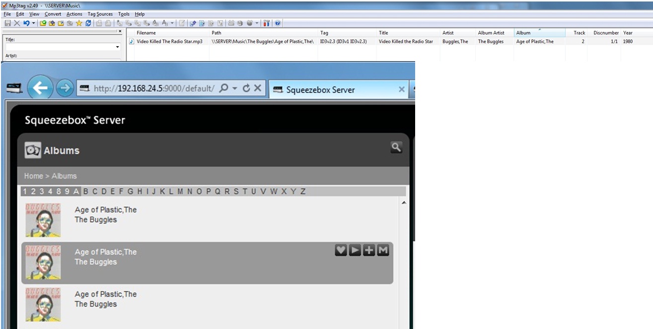 This issue exhibits itself in 2 different ways. 1) Albums appear more than once for the same track. For example, in my collction, the album "the age of plastic" has only one track in it (one music file). This album appears multiple times in the album listing for the same track. It should obviously only appear once. 2) Albums are "fragmented" into multiple albums with the same name with the majority of tracks in one album and the remainder (ususally one track) in a duplicate This behaviour was not present on 7.5.1 Whilst it has been noted that the the new scanner in 7.6.x is more sensitive to minor anolalies in metadata, example 1) clearly illustrates a bug with the scanner, as the source metadata for the duplicated albums is coming from one file only. Full rescans do not change the behaviour. This issue can be replciated at will.