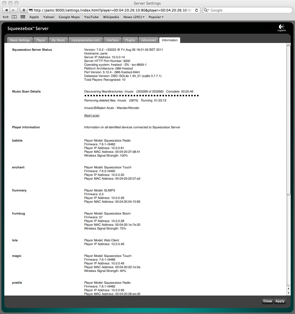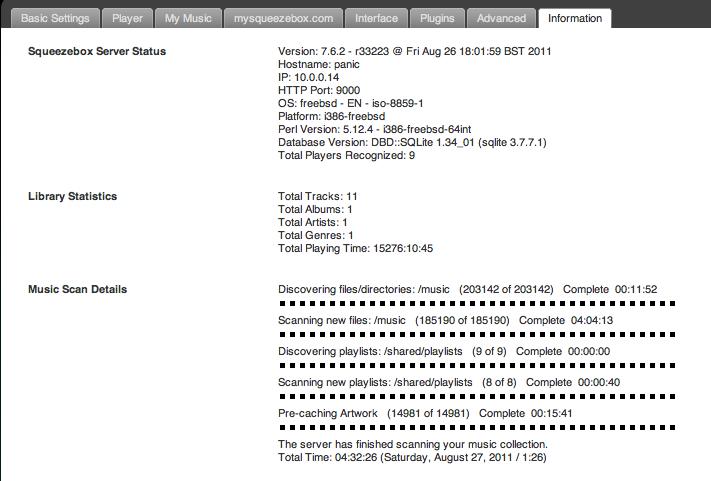 Using FreeBSD. No plugins other than those shipped out-of-the-box. rm *.db done before the wipe scan. I've not restarted SBS on my FitPC2 since seeing this on Friday (I just wanted to see how long the poor little thing would take to scan). http://virgin.xenopsyche.net:9000