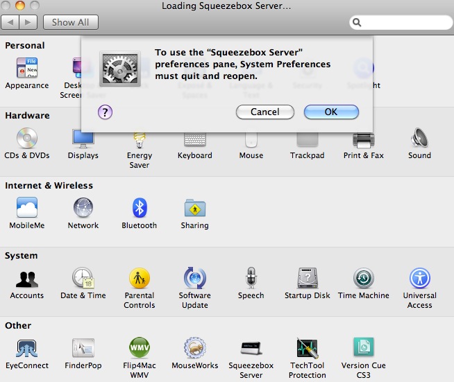 2 or 3 times a day my system preferences dialog box opens for no reason, with squeezebox server asking to reopen the sys prefs again - see attachment. I'm aware that I need to reopen the sys prefs when I want to access the SB server due to OSX v10.6, but this just happens continually without me wanting to access SB server. I've clean installed SB server several times but only alleviates problem for a week or so and I spend an hour or 2 setting everything up (recognizing SB, faves, my apps etc) Tech support says there's nothing they can do, that it's a bug. Well it's a pretty damn big bug! Every time I upgrade SB server something goes wrong and I always spend too much time resetting my whole SB environment. PLEASE FIX SOON - MY PAST FAVOURABLE OPINION OF YOUR CO IS FADING. Thanks, Greg.