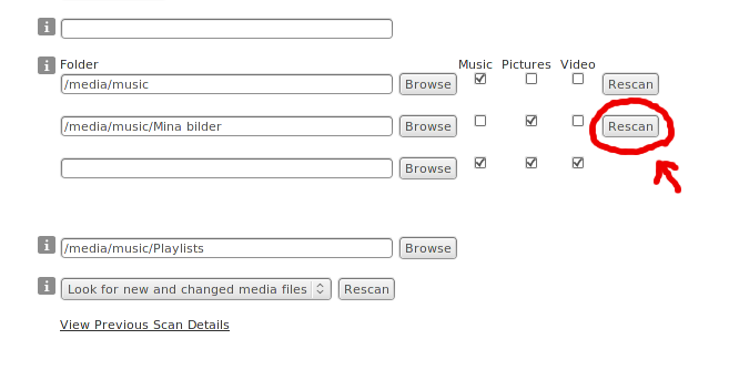 Tried your theory of my nested mounts ,now my music folders looks like. /media/sda1/music1 (music ) /media/sdb1/music2 (more music ) /media/sda1/Mina bilder (the picture folder) /media/sda1/Playlists (my playlists ) it still scans all/wrong folders whatever i do . So this bug is still valid Even if I select a playlist scan it does a look for new and changed in all folders ? I will upload more scan logs , note that my playlist are broken, I'm adjusting them now (an effect of the relocation)