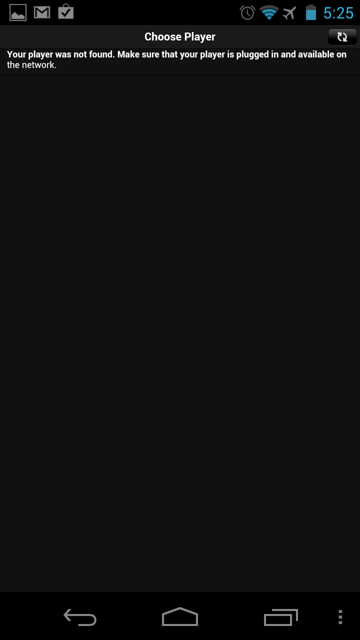 I can confirm this is a real bug and not some temporary glitch or network issue. With the device in airplane mode and only connected to the same local wifi network the Logitech app fails to detect the players. A paid controller application in the market on the same device with the same connection finds the players without issue. I have attached a screenshot of the failed discovery attempt in airplane mode on wifi-only. Please confirm this bug. The app rating on the market is taking a beating because of it, and as more devices get Ice Cream Sandwich the rating will only get worse.